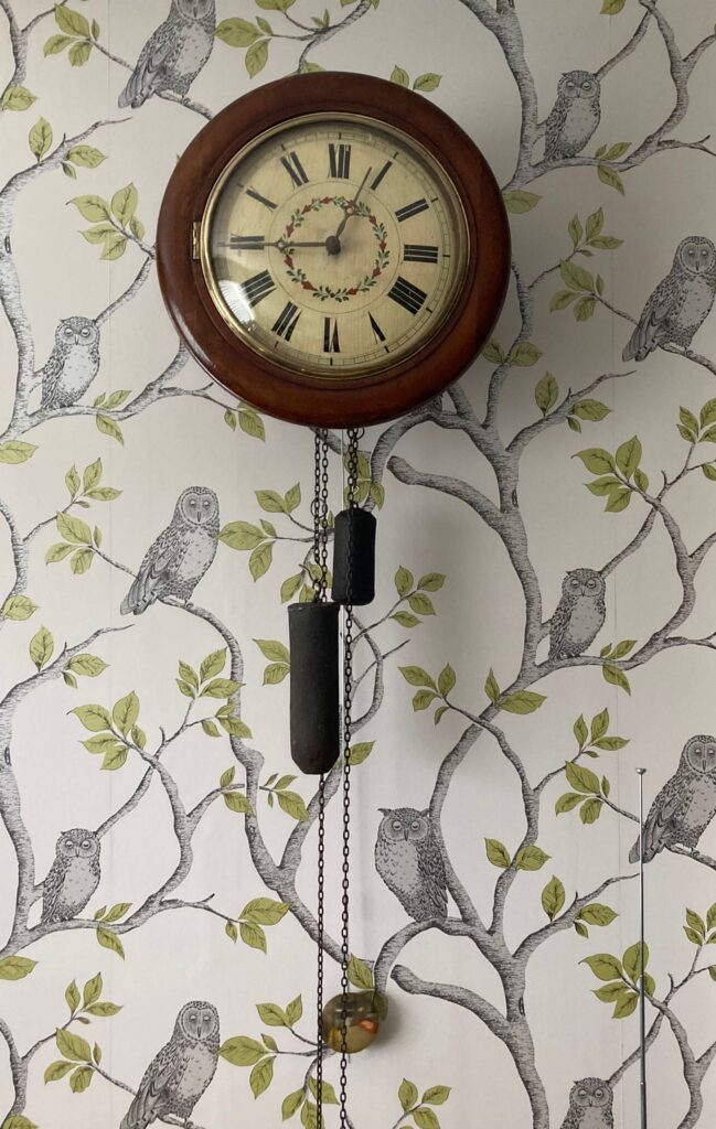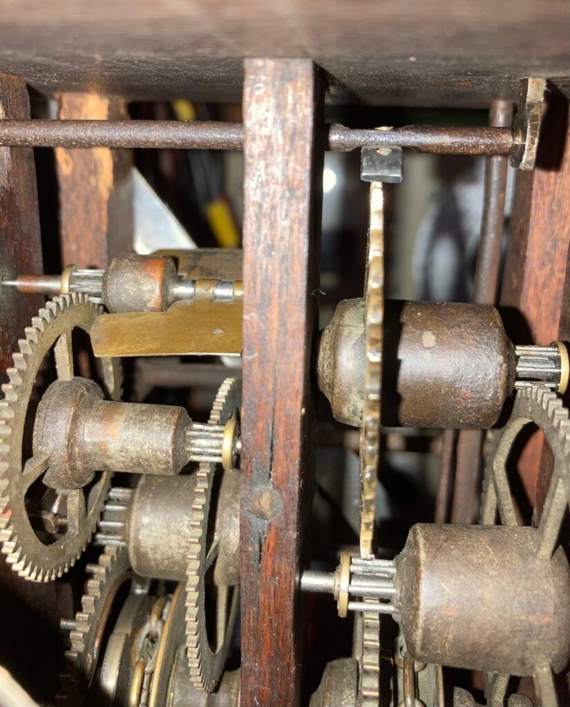 Phil here again, and thanks to Justin for kindly letting me post another blog describing one of my own projects that I’ve recently completed during my summer break away from my voluntary duties at the Black Country Living Museum. This one is a c.1840 weight-driven Black Forest 30-hour striking wood-movement clock, which I’ve been restoring on-and-off since I bought it for £40 from an antique shop in Wales several years ago. The main problems were woodworm, a butchered escapement, a badly-waisted pivot on the going great wheel, a too-short pendulum and a warped dial. The bent-strip pallets needed replacing, as did the bushings for the pallet arbor. There are several non-original parts in this clock, but I decided to keep most of these as they are functional and not seen. I bet Justin has repaired dozens of clocks like this! I took a liking to it when I saw it languishing in a Welsh antique shop four years ago. I did a bit of research and discovered it was a Black Forest “Schwartzwälder Stollenuhr” and made around 1840-1850, judging from the brass wheels on wooden arbors. When I got it home, I found it had once been well-inhabited by woodworm, so following Museum practice I applied the usual liquid Rentokil treatment, then wrapped the whole thing in a plastic bag and bunged it into the deep freeze for a month! Once satisfied that there was no active worm present, I filled most of the visible flight holes using coloured furniture repair wax sticks. I tried the clock, and whilst the strike side worked, the going train wouldn’t run for more than a few ticks before stopping. At this point I realised that this wasn’t really a clock; it was someone else’s abandoned restoration project. The bent-strip pallets had clearly been replaced, but looked nothing like a Black Forest escapement and gave no impulse. The pallet arbor pivots had been roughly filed and were closer to square than round, the crutch was loose on the arbor and the back pivot “bridge” had been replaced by a bit of thin steel plate with a hole crudely drilled through it. Much time was spent turning the pallet arbor pivots true and bushing the front and back pivot holes, to at least get the pallet arbor rotating in a proper manner. Dismantling a wood-movement clock needs care, and it helps to know the sequence – I found out by trial and error. Essentially this movement comprises a solid timber frame made up of a top and bottom plate and seven vertical pillars. The four corner pillars and the middle one – think of the number 5 on a dice when viewed from above – are permanently fixed in place and give the frame its rigidity, but the front and back centre pillars – which contain all the pivot holes – are removable, once you’ve pulled out the nails which hold them in place through the top plate. The precision fit of these old wooden parts is actually quite remarkable. I researched and found a drawing of the traditional Black Forest escapement, a small bent-strip pallet not unlike that of a cuckoo clock, spanning just three-and-a-half teeth of the escape wheel, and hence narrow enough to pass through the small aperture in the fixed centre pillar of the wood movement frame. I started with a new American bent-strip pallet, which I hacksawed down to size and bent into shape as best as I could. I temporarily soft-soldered the pallet to the arbor and adjusted the angles by trial-and-error till I got reliable running, then drilled through the strip ready for rivetting. I polished the pallet working faces to a mirror finish, hardened them by heating to red heat then quenching in water, polished again, tempered to a light straw colour, quenched and polished again. Finally I rivetted the pallet to the arbor using a brass rivet, turned down on the lathe to the correct diameter. Happily the escapement still ran, although not very well, going in and out of beat as the escape wheel rotated, and occasionally stopping due to one tooth failing to release. The escape wheel contains 42 teeth. Watching the escapement in action, it became clear that two groups of teeth were very slightly shorter than the rest. Using thin duck-billed pliers, I carefully ‘drew-out’ the short teeth, then placed the escape wheel in the lathe and very lightly ‘topped’ the teeth to the same length, using 3,000-grit abrasive paper on a wooden backing pad rather than a file. This process was completely successful, and the escapement now ran reliably. The means of setting the depth of the pallets’ engagement with the escape wheel is incredibly crude. The front pallet arbor pivot is like a flattened nail, held by friction alone through a hole in the top plate; adjustments are made by tapping it down with a hammer, or pulling it up with pliers. The back pivot runs in a bridge with slotted mounting holes, offering a degree of ‘fine’ adjustment. The two trains on these clocks sit in tandem, front to back, with the going train in front of the strike train. The back pivot of the going train’s great wheel was badly waisted. Rather than re-pivoting in the normal way, which I considered impossible due to the small diameter of the arbor itself, I decided to make a sleeve by turning down a piece of steel rod to fit the pivot hole, then drilling down the centre of the rod to create a sleeve to slide over the waisted pivot, finally soft-soldering it into place over the old waisted pivot. Purists may recoil in horror at the use of soft solder in clock repair; as an electrical engineer by profession, but an amateur horologist, I am reasonably skilled in soldering and it can form an effective – and invisible – repair in certain cases such as this. It’s worth mentioning the pivot holes, which in most wood-movement clocks are actually formed from thin brass strip coiled into a slotted tube (shaped a bit like a Mills pin or clevis pin) and fixed firmly into the wood. These are difficult to assess for wear by the usual means. Suffice it to say that e